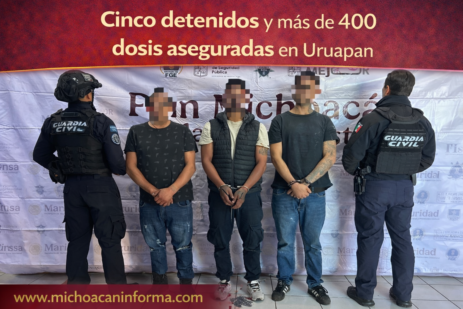 En un primer hecho fueron detenidos tres hombres en posesión de tres armas cortas calibre 9 milímetros, 26 cartuchos útiles y 40 dosis de una sustancia con características del cristal. Lo asegurado fue puesto a disposición de la Fiscalía General del Estado.