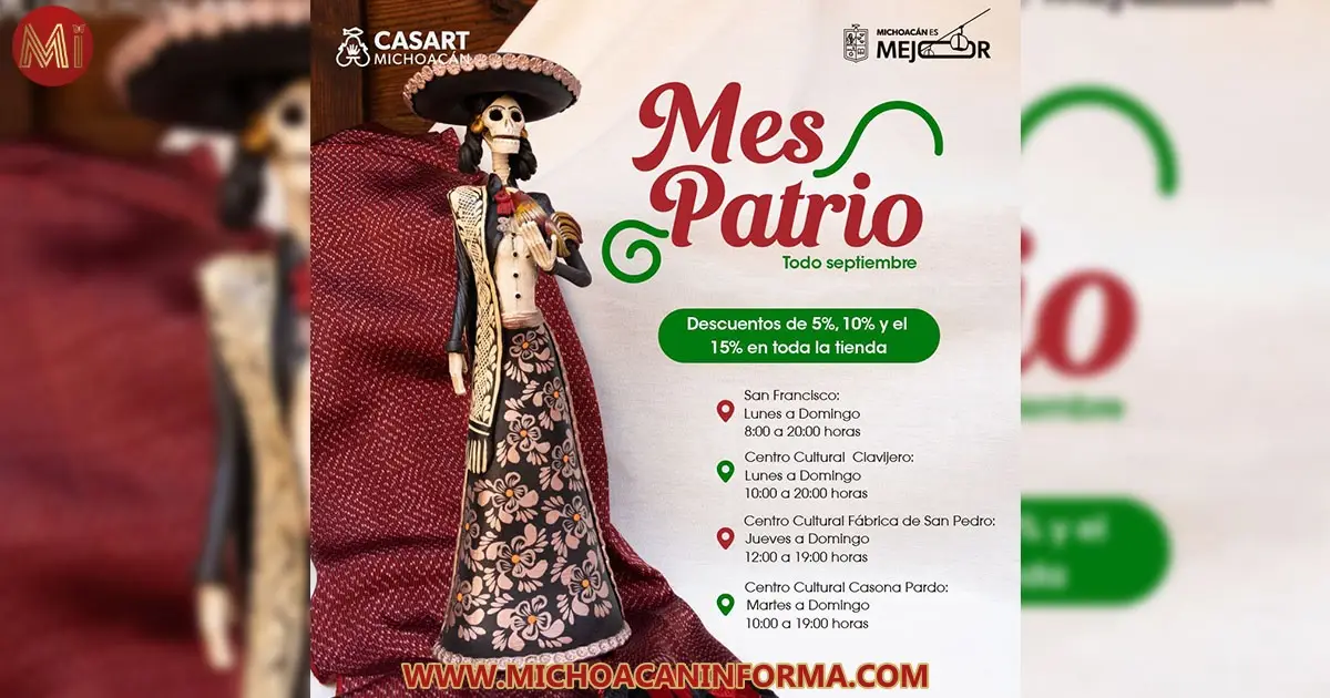 La Casa de las Artesanías de Michoacán (Casart) invita a celebrar el mes patrio con descuentos del 5 al 15 por ciento en todas sus piezas, disponibles hasta el 30 de septiembre en sus tiendas.