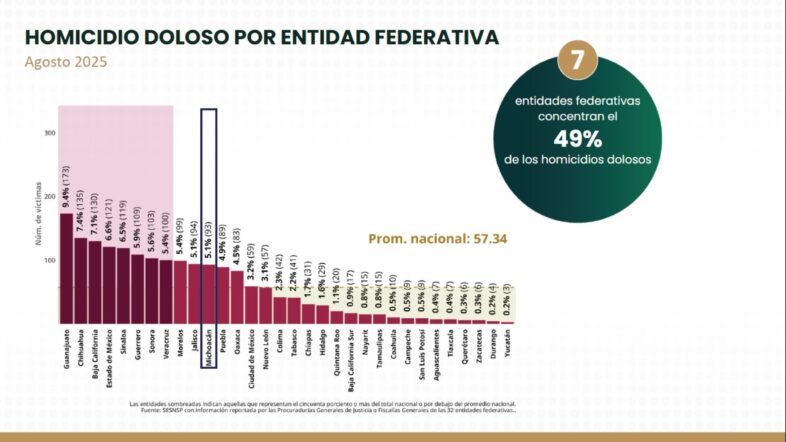 De acuerdo con Marcela Figueroa, titular del Secretariado Ejecutivo del Sistema Nacional de Seguridad Pública, Michoacán ocupó en agosto el onceavo lugar nacional, fuera de las siete entidades que concentran el 49 % de los homicidios dolosos.