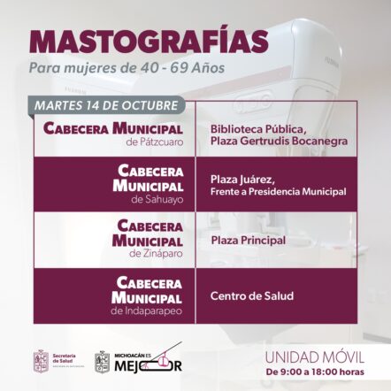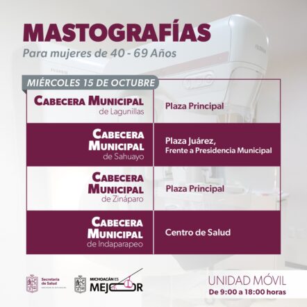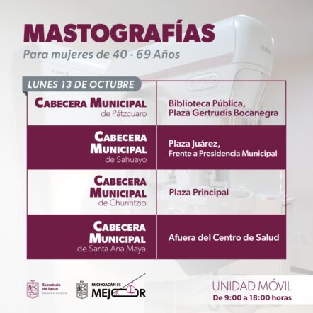 Morelia, Michoacán, 11 de octubre de 2025.– Como parte de las acciones del Mes de Sensibilización sobre el Cáncer de Mama, la Secretaría de Salud de Michoacán (SSM) desplegará del 13 al 17 de octubre unidades móviles de mastografía en 12 municipios del estado, con el objetivo de acercar servicios de detección oportuna a las mujeres michoacanas.